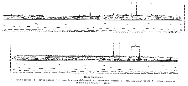 Приметные пункты. При подходе к порту Бердянск приметны телевизионная мачта, стоящая в 8 кбт к NE от основания мола, трубы заводов и отдельные здания города Бердянск, а также башня и труба дома отдыха на восточном берегу Бердянской косы.