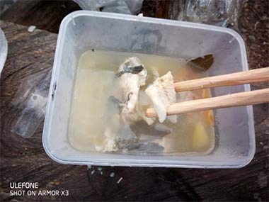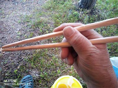 Признаюсь, я этой ложкой попользоваться практически не сумел, так как от горячего она сразу деформировалась. Поэтому я выстрогал пару палочек, и с помощью их ел и кашу и уху (доставал кусочки, а юшку хлебал через край).