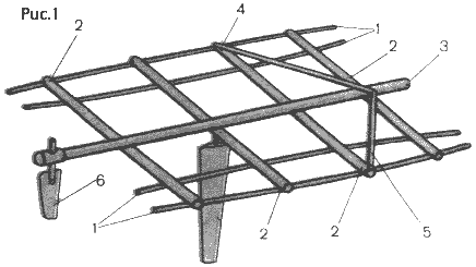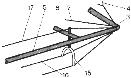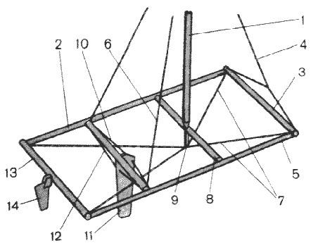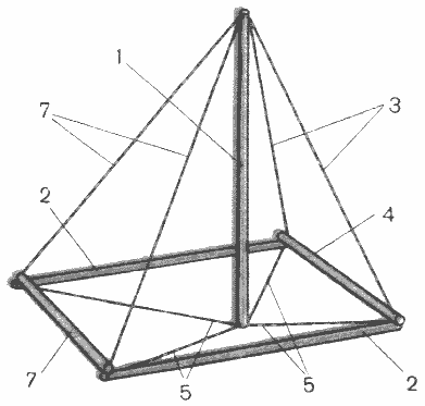 Мачта 1 подвешена в центре рамы, образованной продольными элементами жесткости поплавков - балками 2, носовой поперечный балкой 4 и кормовой балкой 6. Мачта раскреплена стальными тросами; снизу ее поддерживают растяжки 5, сверху они растянуты форштагами 5 и ахтерштагами 7. Мачта не опирается на какую-либо балку, и тем не менее она жестко зафиксирована относительно рамы. Все узлы схемы вместе образуют пространственную конструкцию, не изменяющую свою форму под нагрузкой (в пределах прочности самой слабой детали).