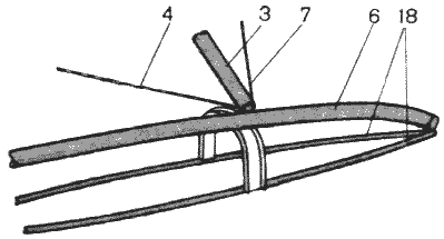 Трубчатая ферма (рис. 3,б) состоит из изогнутой продольной балки 5, лежащей на верхней части П-образного шпангоута 15, согнутого из швеллера или трубы. Диаметр и толщина стрингеров 18 меньше, чем у балки 5. Стрингеры крепятся к нижним концам шпангоутов. На поплавке стрингеры фиксируются так же, как в предыдущем случае.