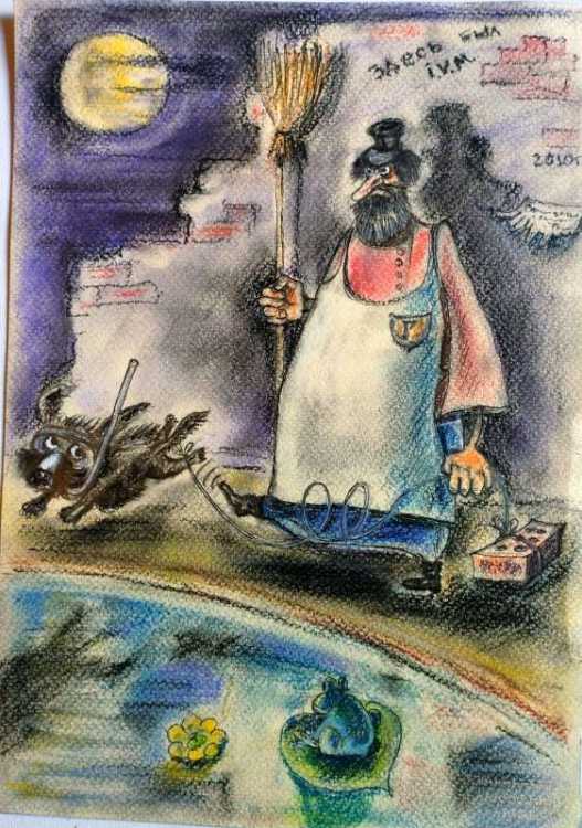 ...Как бы продолжение "Му-му" в моем представлении. Вечер. На полуразвалившейся кирпичной стене ветер вяло шевелит отрывные номера телефона на бумажнм объявлении, в котором корявым почерком написано следующее: "Опытный тренер обучит дайвингу вашу собаку. Обращаться в дворницкую, спросить Герасима."