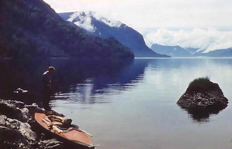 Вдвоем: Григорий Шмерлинг и Владимир Чернов, Надин брат. Байдарка "Нептун" со штатным рейковым гротом. Ради экономии веса шверцы (и стаксель) даже не брали, использовали парус только на озере и всего несколько раз: почти все время штиль. Так что парусным поход можно считать весьма условно. Но, все-таки! Натренировались при подходящем ветерке, втыкать мачту и поднимать парус, а потом сворачивать все и укладывать на крючки по борту, наверное за минуту, не больше!