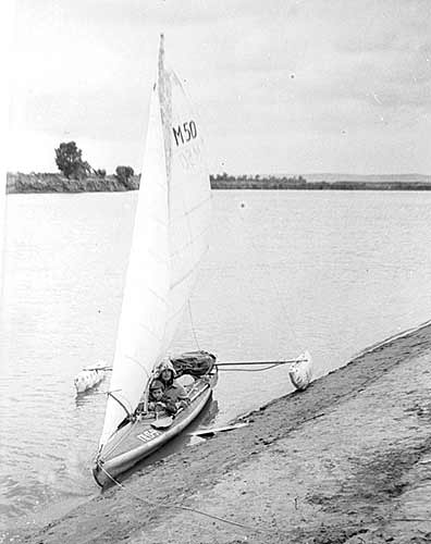 Шверт у нас был и солидный - с изрядными трудами вырезанный из фанеры, профилированный как NASA прописало и оклеенный стеклотканью. А вот шверцбалки не было: ее прекрасно заменила веревочка, которой шверт привязывался к каркасу. Как только опускаешь шверт в воду с подветра, сила дрейфа мягко и плотно прижимает его к поддувному борту, и он прекрасно выполняет свою роль. С центровкой, заглублением, мелями - никаких проблем. Если ветер стих до нуля, шверт всплывает - ну, значит пора брать весло. Кроме того, "пристяжной" шверт служил и сходнями, а иногда и столом.