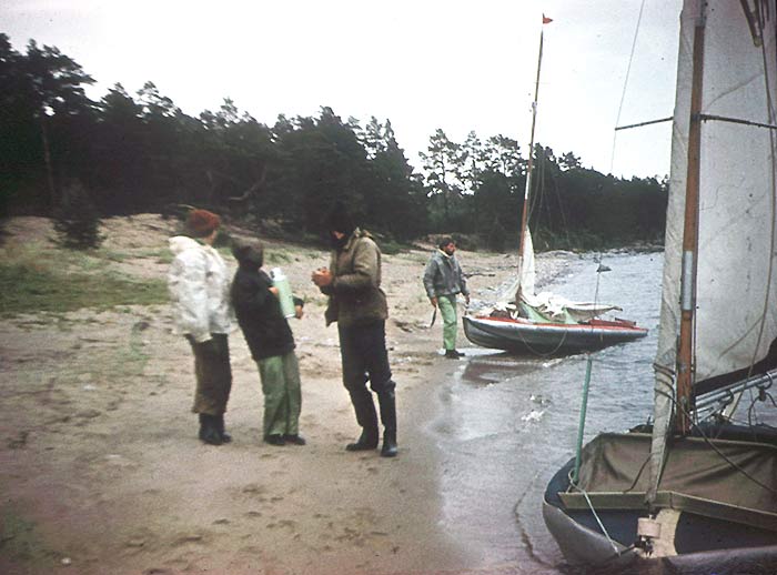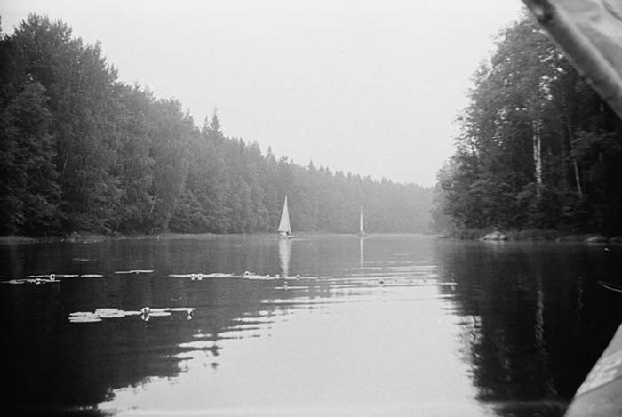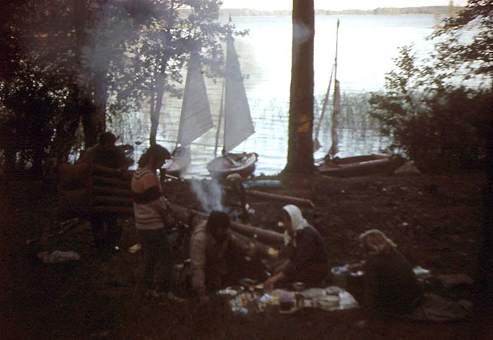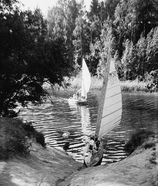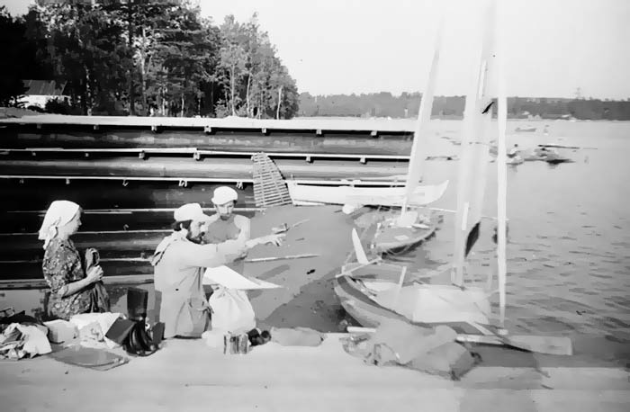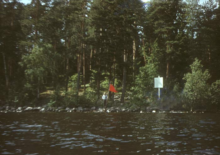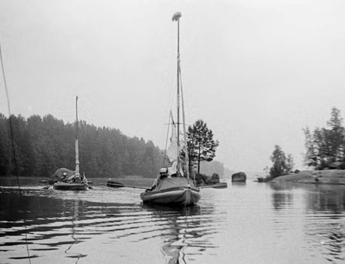 Кто там с красным знаменем? Белоозеров! Он возглавлял учебный поход парусной школы по Вуоксе, который здесь заканчивался.