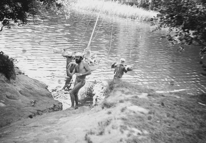 ...а джигитовка на Меве. Мы с Витей после этого похода собрались сходить на Азов, пройти двумя лодками от Геническа на Казантип напрямую, с ночевками в море. (Хорошо иметь "химический" отпуск 45 дней!). Надо было понять, можно ли в случая оверкиля вернуть Меву на ровный киль и идти дальше. Предполагалось, что мой тримаранчик может быть залит, но не перевернется, а большой объем надувных емкосей (матрац и пр. и пр.) позволит двигаться, пусть и сидя в "ванне". Все получилось без аварий, но это уже другая история.