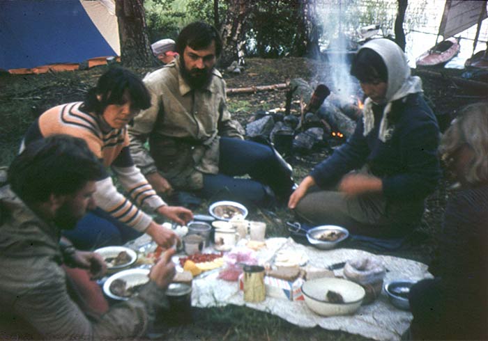 Вечером был общий пир. Оказывается, Юля и еще две девушки из их компании, Ира и Аня, были на Топах в 79-м. Помнили, как мы варили им супчик и "за шкирку закидывали на катер"...