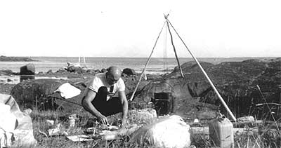 На о.Чернецкий избушка и несколько оленей, которых мы видели, бродя по острову в поисках места для лагеря. Только лишь мысль о комарах заставила нас отказаться от ночевки на нарах в ихбе. Лагерь разбили на прекрасной ровной без камней площадке размером 30х15 м, приподнятой метра на два над уровнем моря. Наши палатки польского производства с цветными тентами смотрелись здесь как будто в рекламном журнале.
