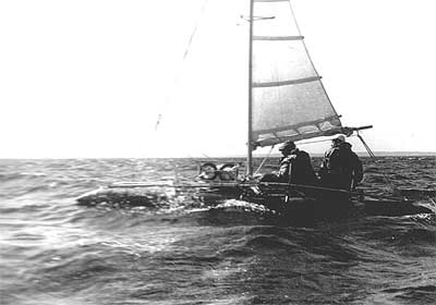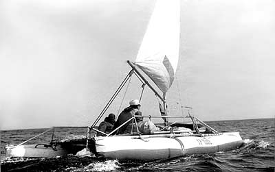 Но вот по воде прошла легкая рябь, вот опять, вот еще вот нас уже подхватывает ветер и, значительно усиливаясь к о.Немецкий Кузов, вталкивает в пролив между ним и о.Русский кузов, прямо к стоящему на якоре тримарану В.Байбакова, Дружеский вид лайки по кличке Вайда не оставляет сомнений в том, что В.Байбаков опять путешествует в одиночку.