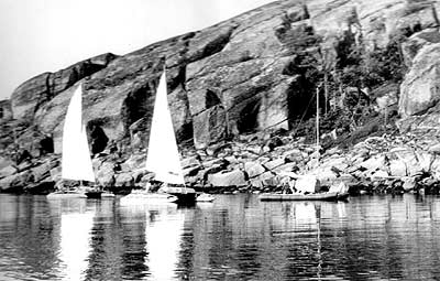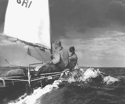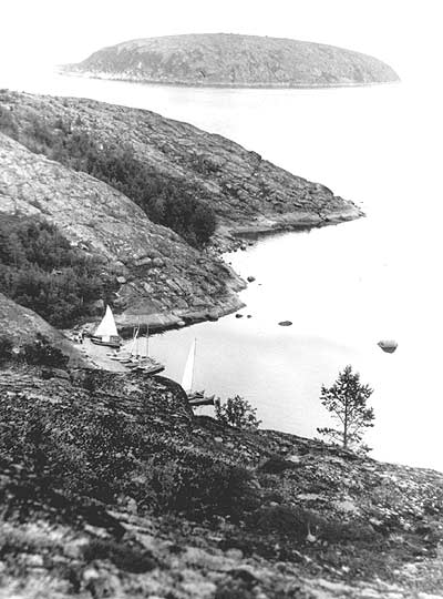 И вот море. Ветер 2-3 балла. Поднимаем паруса, следя за выступающими из воды лудами. Настраивай, делаем поворот оверштаг и приступаем к лавировке из губы. Справа по борту виднеются паруса нескольких "Альбатросов" на берегу. Один парус на воде. Но где ему за нами угнаться!