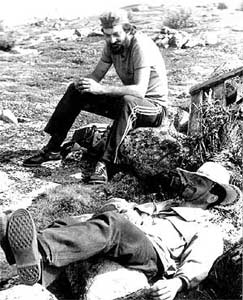 Какая дневка в хорошую погоду без купания и загорания на солнце! Витя Д., морж известный не только нашему клубу, путешествовал исключительно в пляжном костюме. Взятый им арсенал одежды состоял из нескольких плавок, трикотажной Футболки выцветшего синего цвета, трикотажных же брюк с вытянутыми коленями штурмовки, солдатской шляпы и ватника, покрашенного им самим в пятнистый цвет, путем развешивания на ветках дерева и опрыскивания зеленовото-желтой краской из аэрозольного баллончика, купленного в хозяйственном магазине.