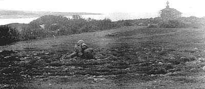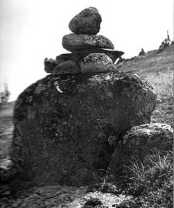 Плато обрывается уступом. На уступе стоял в старину темный крест с заклятием:"Изыди, сатана!". Сейчас его нет. Внизу слева и справа еще кресты, треугольнк мыса отделен и полосой валунов. В свое время это место обозначала табличка "неолитические свя-тильники". Лабиринт. Саамские могильники". Приглядевшись, видишь в нагромождении камней закономерности, запутанные ходы.