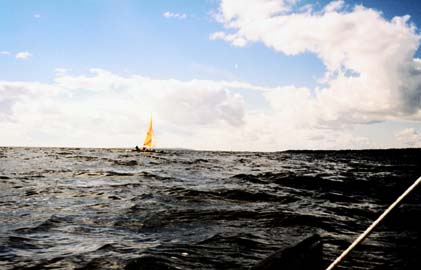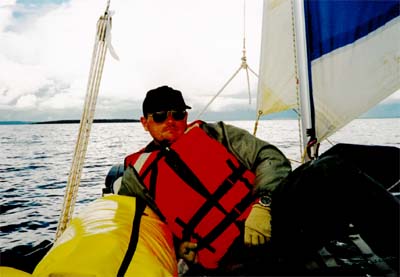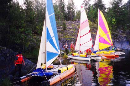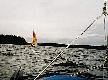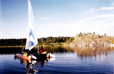 Позавтракали в компании с Коляном, свернули лагерь, и в 10.30 были готовы к отплытию. Отплытие было задачей не из простых: пятеро из шести членов нашей команды никогда не отходили от берега в условиях каменистого мелководья при навальном ветре и достаточно сильном прибое. Мне пришлось заранее расставить всех по местам, шаг за шагом проинструктировать каждый экипаж о порядке действий. Когда наконец два первых экипажа достаточно коряво, но все-таки благополучно отошли от берега, начали готовиться к отплытию мы с Сашей Белиным. Колян с грустью провожал нас, стоя у кромки прибоя, и когда островок с мудреным финским названием, означающем что-то типа “остров птичьих гнездовий”, стал таять за кормой, я физически ощущал одинокую фигуру Коляна, грустно смотрящего вслед нашим уходящим парусам.