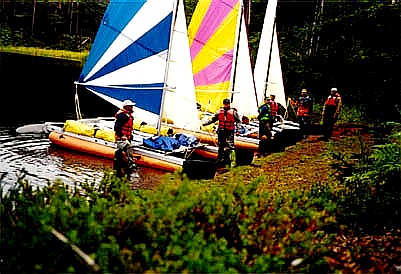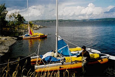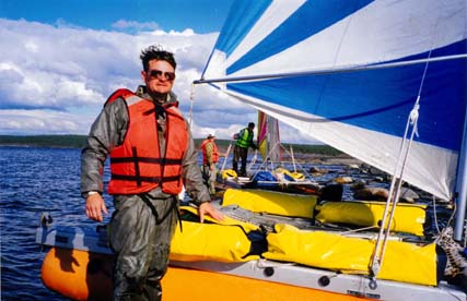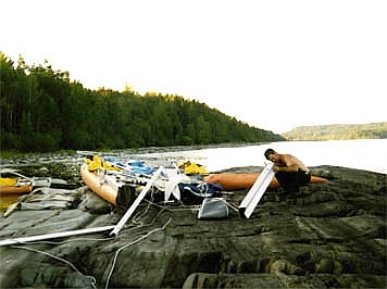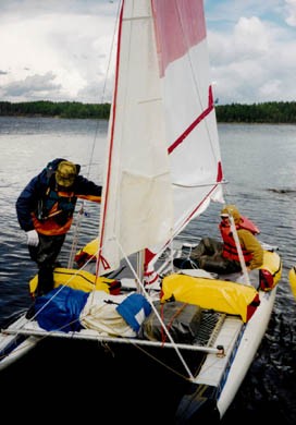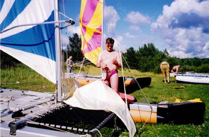 С утра, позавтракав рисовой молочной кашей с изюмом и курагой и оставив в лагере кока Валеру для сбора грибов и приготовления обеда, вся команда переплыла на поляну-стапель чтобы сегодня закончить сборку наших плавсредств. К 15 часам три парусника один за другим вышли в акваторию Шарового залива и при полуторабальном южном ветре походили различными курсами. Паруса, такелаж и рулевое управление катамаранов работали как часы. Мы искупались, отрабатывая вводную “человек за бортом”, позагорали на еще свободных от груза натянутых как барабан трамплинах катамаранов, половили рыбу. Выход на маршрут отложили на утро следующего дня.