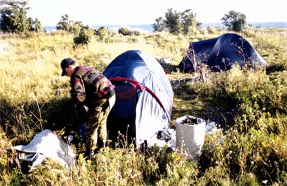 Еще на подходе к берегу мы с удивлением различили на фоне кустов невысокую фигуру в замызганной штормовке, которая бродила по берегу в ожидании незваных гостей. Затерянный посреди студеных вод каменистый клочок суши, поросший редким кустарником, оказался обитаемым! Когда мы высадились на берег и вытащили на гладкие валуны наши катамараны, ситуация с обитателем необитаемого острова прояснилась. Оказывается, местные рыбари из Сортавалы облюбовали стоящий в самом центре северной части Ладоги островок в качестве опорной базы для рыбалки. Пару дней назад они хорошенько выпили, после чего решили на своей казанке возвращаться домой. Но так, как Колян – так звали нашего нового знакомого – оказался в нетранспортабельном состоянии, его на неделю оставили на острове в старенькой самодельной палатке. Колян пожаловался нам, что от шума прибоя и гомона чаек он тут уже озверел. А других звуков здесь нет, и поэтому, чтобы крыша от одиночества у него окончательно не съехала, он целыми днями во весь голос сам себе поет матерные песни. Колян ходил за нами по острову, как хвост, немного стеснялся нас и поэтому был ненавязчив. Когда мы разбивали лагерь, он тихо сидел поодаль на пригорке и наблюдал за происходящим. Когда мы приготовили ужин и пригласили его к столу, он сильно засмущался, но в конце концов принял приглашение и с удовольствием взял в руки кружку с живительной огненной водой. После второго тоста он уже относился к нам, как к ангелам, ниспосланным к нему с небес.