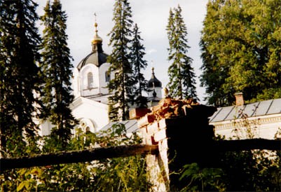 Неизгладимое впечатление оставил Скит Всех Святых или Белый. Это мини-монастырь, огороженный стеной по типу крепостной. У стены уютно примостились огороды с ухоженными грядками. Светлели на солнце огромные кочаны капусты. Напротив западных ворот стены на опушке леса стояла добротная лесопилка. Возле нее трудились два молодых благообразных монаха, не обративших на нас никакого внимания. Внутри периметра стены раскинулся обширный двор с хозяйственными постройками, колодцем и братскими кельями. В центре высилась красивая белая церковь. Светило солнце, стояла первозданная тишина, которую нарушало только пение птиц и шелест ветерка в кронах деревьев.