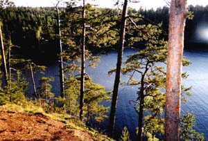 Имея на руках карту, мы умудрились еще раз заблудиться, и незаметная лесная тропка привела нас к заброшенному в лесной чаще древнему каменному скиту. Рядом в густой кроне сосны, стоящей над лесным озером, примостился маленький деревянный скитик с крестом на крыше. По стволу сосны наверх вела деревянная лесенка. Этакая избушка на одно спальное место, висящая над головой.