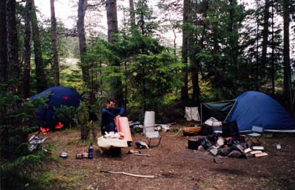 В лесу в двух десятках метров от воды мы обнаружили чистую ровную поляну со следами костра и палаток. С трех сторон поляну окружал высокий лес, с густыми зарослями черники. Идеальное место для стоянки! Пока мы обследовали район нашей высадки, к берегу подошел третий катамаран. Мы завели все три судна в удобную мелководную бухту, закрытую от волн плоскими плитами-волнорезами. Два катамарана зашвартовали, а мой вновь вытащили на плоский камень для ремонта.