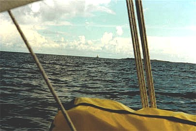 Наш экипаж и Дойниковы продолжали движение на север. Флагман начал уваливаться под ветер, все больше и больше удаляясь от нас на восток. Когда мы миновали валаамскую гряду и вышли на открытый простор, бело-красный парус флагмана скрылся из виду за Байевыми островами.