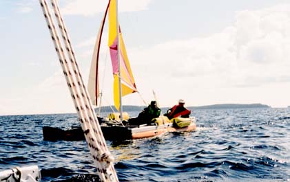 Не смотря на почти полуторачасовую фору мы быстро нагнали Зеленого Змия, и он, стыдливо юркнув в шхеры, скрылся в одном из многочисленных заливов. Эскадра шла длинными левыми галсами, иногда делая короткий контргалс, чтобы набрать высоту, и постепенно растягивалась. Более легкий катамаран Дойникова ушел вперед. Мы старались не гнаться за ним, оберегая судно от дальнейшего разрушения. Более тяжелый флагман замыкал строй.