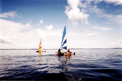 Через пару часов наш катамаран был уже на воде. Мы с Сашей Белиным обкатали его в заливе, затем пришли на помощь двум другим экипажам. Вскоре выяснилось, что новые перья рулей плохо ложатся в балерные коробки. Пришлось заниматься их подгонкой. В результате процесс сборки затянулся до самого вечера. К ужину один катамаран под парусами и два без рангоута на веслах перебазировались на остров, в бухту с северной его стороны. Окончание сборки было отложено до завтра.