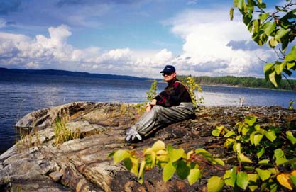 Погода была изумительная. Светило яркое летнее солнышко, по голубому небу не спеша ползли белые пирамидки кучевых облаков. Мы вскарабкались по наклонным скалам наверх, нашли удобную поляну, закрытую с двух сторон гранитными грядами, собрали на ней все грибы (десятка три подосиновиков, подберезовиков и белых), быстро разбили лагерь, приготовили из собранных грибов обед, и отдых на природе начался. Дойниковы пошли на южную оконечность острова ловить рыбу. Яков ушел бродить по острову в поисках грибов. Я вдруг ощутил, что с прошлого лета соскучился по сочной, прямо с куста чернике и бруснике и полез на прогретые солнцем высокие гранитные лбы, сплошь усыпанные спелой ягодой.