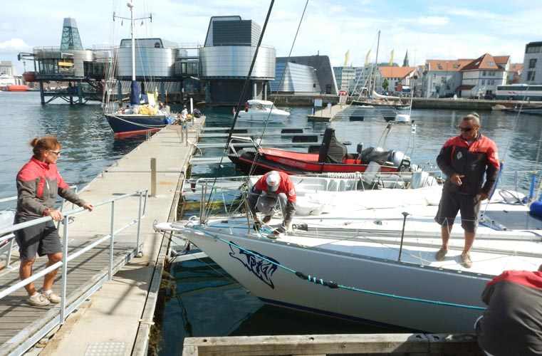 Попытался зацепиться за западный берег метрах в 300 от стоянки для Седова, нашел разрыв между какими-то причалами метров 20, там даже лесенка была и здоровенное кольцо. Растянулся веревками, а то все волны от судов мои. Выгнали и оттуда, изверги. Мол, здесь еще территория порта, низзя! Сказали уйти на остров (там большая марина, но добираться в город по мосту неудобно) или еще дальше. Ушел. Причал у каких-то летних домиков с надписью Welcome to Stavanger и правда оказался гостеприимным. Рядом сидела небольшая компания, звенели бокалами, смеялись.