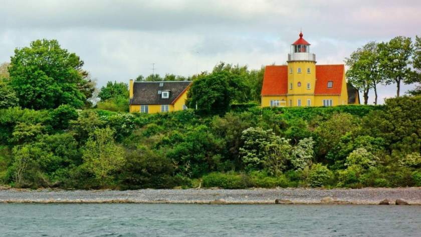 Вдоль скал медленно скользил экскурсионный кораблик "Discovery Klintholm" - старый кеч, переделанный из какого-то рыболовного суденышка. Мачты на нем - исключительно декоративные. Кораблик возит туристов из рыбной гавани Клинтхольма до утесов и обратно. Наши с ним пути разминулись. Я пошел дальше на запад в сторону порта мимо галечных пляжей и высокого берега, на котором ярким желтым пятном выделялся маяк. Не знаю, почему, но я очень люблю маяки и ветряные мельницы, потому пользуюсь любой возможностью, чтобы их запечатлеть.