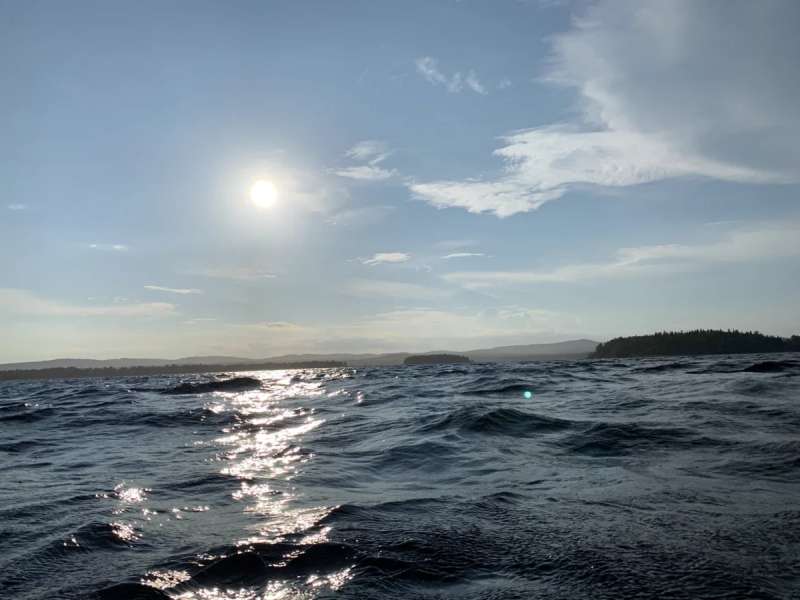 Дождались прилива. Млели на солнышке. Ветер совсем слабенький. На веслах выгребли за остров, там поехали. Дуло 3-4 узла северо-запад, к вечеру ветер стих и отошел на западный. Сегодня ехала без гидрашки - в лёгкой футболке - жара. Тихо, но верно. Последние несколько километров ветер совсем сдулся, но моторить не хотелось - шли на веслах.