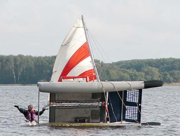 ветра мы неохотно опустили спинакер и подняли стаксель. По хорошему, следовало испытать якорь, но мы слишком устали, чтобы заниматься экспериментами. Через 10 минут на трамплине была установлена палатка. После целого дня гонки у меня осталось только 2 несовместимых желания. Спать и носиться под всеми парусами. Правда, когда мы забрались в палатку, первое желание быстро победило. Мы отзвонились Дмитрию о благополучной остановке на ночлег, и когда после продолжительной борьбы с отсыревшими кнопками телефона мне удалось завести будильник, провалились в сон. Перед тем как заснуть, я только успел подумать, что такой интересной пятницы тринадцатого у нас еще не было. В 3:20 адская машина прервала наше наслаждение, и взяв в союзники Таньку, заставила выметаться из палатки, укладывать вещички и поднимать паруса. В начале пятого мы выбрались из камышей и в сером холодном сыром воздухе подняли мокрый спинакер. Потом пришлось долго идти в острый бейдевинд, пока русло Волги не повернуло на восток. И снова под спинакером мимо отсыпки-крапивы-малины, Грабиловки, Клинцов в сторону Шевницы. Ветер не сильный, ровный попутный курс усыпляет. Румпель лежит на липучке, глаза слипаются. Когда я просыпаюсь через минуту, вижу, что жена сладко спит со спинакер-брасом в руках. Ничего себе - летучий голандец! О такой опасности я еще не слышал. Мы за правым краем судового хода, а слева на траверзе движется навстречу белый пароход. Когда я вижу, что жена просыпается, то говорю ей: "Смотри! Дубна идет!" Когда я увидел ее испуганный озирающийся взгляд, то пожалел о своей шутке. На подходе к Шевнице ветер усилился. Появились маленькие волны с редкими барашками. С помощью спинакера мы обгоняли их одну за другой, рассекая их с красивыми белыми бурунами. Жалко некому нас сфотографировать со стороны. Третий год катаемся на катамаране, и нет ни одной красивой фотографии нашей лодки на полном ходу. За 30 м от берега опускаем спинакер и мягко утыкаемся в берег напротив нашей второй палатки, оставленной в лагере. Время — половина восьмого утра. Пока я привязываю лодку и опускаю паруса, Танька радостно бежит будить Дмитрия, чтобы зарегистрировать финиш. Хорошая вещь спортивный азарт. Если бы я был один, то точно не стал бы никого будить, а сразу завалился бы спать. Рассказываю Тане анекдот про то, как парень, вернувшись из армии, чтобы показать, что это такое залез в 4 утра на колокольню и начал бить в колокол. А когда все собрались, объявил, что он с отцом пойдет за дровами, а остальные спать. Поспать, правда, хорошая идея, и мы недолго думая, забираемся в палатку и продолжаем смотреть сны с парусами в главной роли. Мы пришли первыми только по тому, что ралли по каким-то причинам не пользуются популярностью у лучших гонщиков. Весной на Конаковской регате мы выглядели весьма бледно, как и другие чайники, которые только начинают осваивать парусный спорт. Возможно, сказалась некоторые доработки лодки. Из основных, это — спинакер размером 12 квадратов, второй паук на стаксельную и шкотовую балки, перенесенные вперед блоки стаксель-шкотов, покупка фирменных блоков и веревочек, замена стаксель-фала на трос из оцинковки. Ну может быть повлияло еще и то, что мы привыкли двигаться на большие растояния с вещами. Но все равно, думаю, что на Московском море нашлось бы не меньше 10 лодок, способных обог