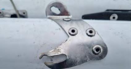 Авария произошла из-за разрыва мачтовой оковки из 1,5-мм нержавейки скобой крепления ванты. В начале похода в этом месте была заметна лишь небольшая естественная потертость.