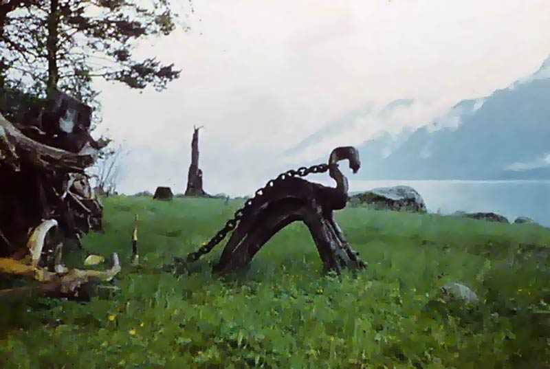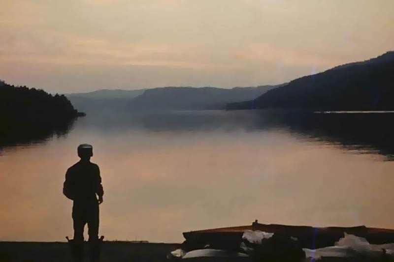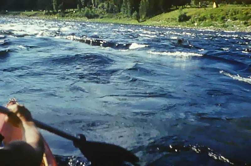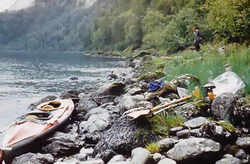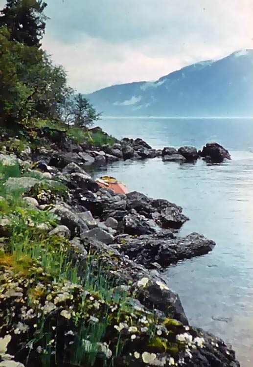 Вдвоем: Григорий Шмерлинг и Владимир Чернов, Надин брат. Байдарка "Нептун" со штатным рейковым гротом. Ради экономии веса шверцы (и стаксель) даже не брали, использовали парус только на озере и всего несколько раз: почти все время штиль. Так что парусным поход можно считать весьма условно. Но, все-таки! Натренировались при подходящем ветерке, втыкать мачту и поднимать парус, а потом сворачивать все и укладывать на крючки по борту, наверное за минуту, не больше!